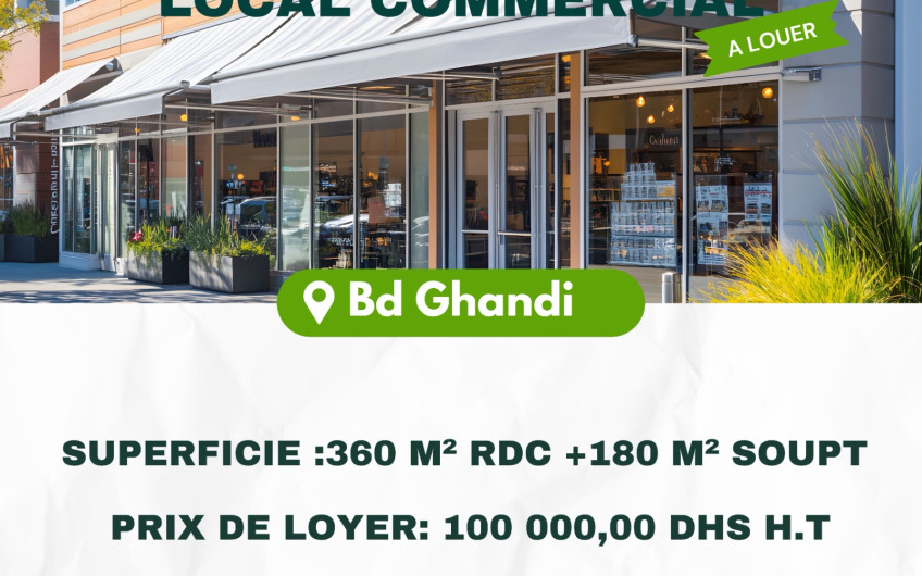 Nous vous proposons à la location un local commercial spacieux situé sur le boulevard Ghandi, d'une superficie totale de 540 m² répartie comme suit :